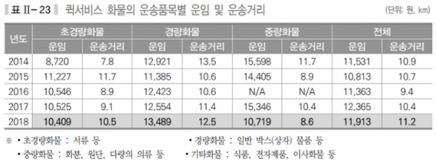 그림2. 퀵서비스 화물의 운송 품목별 운임 및 운송거리. 배달대행과 확실히 다른 숫자들이 나타난다.