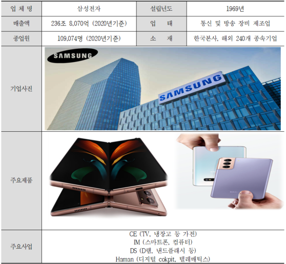 삼성전자는 삼성그룹의 주요 계열사(상장사 16개, 비상장사 43개) 중 하나인 세계 최대 전자회사로서 제품분야 별로 4가지인 CE, IM, DS, Haman 사업부문으로 나누어 독립 경영을 하고 있다. 이 주요 사업부문 가운데 본 연구는 모바일 사업부에 해당하는 IM 사업부에 집중하여 연구조사를 진행하고자 한다. 특히 본 보고서의 중점 대상인 스마트폰 사업은 삼성이 최초의 스마트폰 시리즈인 갤럭시S를 2010년 출시 이후로 지속적인 성장을 이어왔다. 삼성이 이에 더불어 최근 갤럭시Z 폴더블폰 등의 혁신형 기기를 연이어 발표하며 시장 점유율을 더욱 높여왔으며 현재 글로벌 시장에서 선두기업으로 자리매김하고 있다.