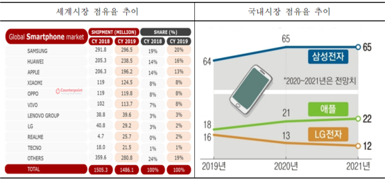 브랜드 별 스마트폰 세계시장 현황에 따르면 ‘19년 세계시장 점유율은 삼성이 20%로 가장 높고 화웨이가 16%로 그 뒤를 잇고 있으며, 애플은 3위인 13%를 나타내고 있다. 주목할 점은 삼성전자는 전년도(’18년) 대비 점유율이 1%만 오른 것과 대비, 2위인 화웨이는 전년대비 2%가 올랐으며, 애플은 13%로 전년대비 1% 하락을 보였다. 이와 관련해 마켓 전문조사기관인 Counterpoint Research는 화웨이가 높은 성장세와 함께 시장 점유율 2위를 차지한 이유에 대해, 화웨이가 ‘19년부터 유럽시장에 진출해 구글 모바일 서비스에 의존하지 않고 5G를 지원하는 스마트폰을 빠르게 출시해서 시장 점유율을 올렸으며, 특히 화웨이의 본국인 중국에서 전체의 60%를 소비하는 등 내수시장의 역할로 큰 점유율을 높일 수 있었다고 분석했다. 다만 현재 가장 세계 스마트폰 시장에서 보편화되고 있는 구글 서비스(메일,포토,지도 등)기반을 보호무역 기조의 미국정부 방침으로 더 이상 이용 할 수 없으므로 화웨이에게서는 글로벌 영업에 제한적인 부분인 점이 향후 화웨이가 극복해야 할 과제로 보인다. 한편 또 다른 국내 스마트폰 업체인 LG전자는 ’18년 대비 ‘19년 3천만대로 판매량이 하락하며 시장점유율도 3%에서 2% 이하로 떨어지며 브랜드 이미지가 계속해서 약해지고 있다. 다음으로 국내 스마트폰 시장은 크게 3개 업체가 점유율을 갖고 있으며, 삼성 65% - 애플 22% LG 12%순으로 기록하고 있다. 특히, 위 상위 3사 제조사들의 시장 점유율은 제품 가격 전략에 따라 엇갈렸다. 삼성은 갤럭시 S20,21를 중심으로 갤럭시 A시리즈 등 중저가 라인업을 보강하여 스마트폰 판매량을 높였다. 2위인 애플의 경우 아이폰11 판매가 지속된 가운데 최근 출시한 아이폰SE 2세대가 매출량을 더 끌어올렸다. 이와 같이 국내시장에서 점점 저렴한 가격의 스마트폰 수요가 늘고 있으며, 전체의 약 45% 판매비중을 기록할 정도로 중저가 스마트폰 수요가 높아지고 있다. 반면 LG전자는 상위 3사 중 유일하게 점유율이 줄고 있는데, 동사는 벨벳, Q61, 윙 등의 신제품을 선보였으나, 이미 경쟁사들의 인기 플래그십 제품들을 상대로 시장 점유율을 반전시키기에는 역부족이란 평가이다.