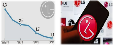 앞에서 본 국내시장 상위 3사 중 하나인 LG전자에 대해 세부적으로 살펴보면, 한때 글로벌 빅3 휴대전화 제조사였던 LG전자가 스마트폰 시대로 접어들어 쇠퇴해오며 현재국내시장에서는 점유율 3위 업체로 명맥을 가까스로 유지해 왔으나, LG전자는 2021.4.22.일 스마트폰을 만드는 MC사업본부 전면 경영철수를 선언했고, 결국 시장에서 LG폰은 역사 속으로 사라지게 되었으며, 이에 대한 반사이익을 취할 삼성과 애플이 치열한 경쟁을 벌일 것으로 예상된다.