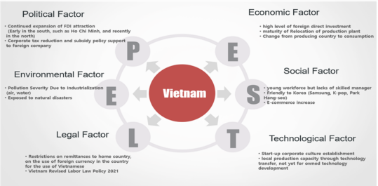 다음은 한국의 상대국인 베트남 시장의 PESTLE 시장환경 분석이다. 먼저 정치적요인(Political Factor) 관련해 베트남은 지속적인 외국인자본 유치정책을 펼쳐오며 FDI 유치를 지속 확대해오고 있다. 초기엔 호치민을 중심으로 자본유치를 해왔으며 최근에는 북부에 FDI 유치를 가속화하며 공장 및 법인 설립시 법인세 감면, 보조금 지원 정책을 통해 외국기업을 유치해오고 있다. 다음으로 경제적요인(Economic Factor)으로 베트남의 경제는 2020년 기준 약3% 신장했으며 외국인직접투자 수준은 75:15:10으로서 다른 아시아지역 국가들에 비해 높은 편이다. 특히 많은 품목의 생산공장이 중국으로부터 베트남에 이전되는 등 글로벌가치사슬(GVC)이 빠르게 재편되어 왔다. 또한 베트남은 과거 초기에 인프라 확대 및 생산중심의 국가에서 현재는 점차 소비지국 가로 성숙화되고 있는 점도 주목해 볼 부분이다. 사회적요인(Social Factor)으로 코로나19 관점에서 볼 때, 타국 대비 코로나19 대응에 선방하여 공장가동률이 크게 떨어지지 않고 생산능력에 큰 차질 없이 대응했다는 평이며, 인구 특성상 다수가 20~30대로서 변화 대응속도가 상당히 빠른 편이다. 또한 삼성 등의 대기업의 현지 정착, 박항서 축구감독 신드롬 등으로 한국-베트남간 문화교류에 상당히 우호적이다. 다음으로 기술적요인(Technological Factor)으로 베트남은 한국 정부와 협력구도 가운데 스타트업 기업육성 분위기에 외국투자유치를 통한 기술집약적 산업을 지속 유치해오고 있으며 특히 전기전자, 자동차산업 고도화에 중점 지원 중이다. 법적요인(Legal Factor) 중 특이사항으로는 베트남 자국 내 투자유치 및 정부지원책의 이점을 갖고 있으나, 외국기업의 본국 송금제한, 자국 내 외화사용 제한 등을 통해 베트남 현지화폐 사용을 강조하고 있다. 그 외 베트남 부동산 토지사용권적용, 외국인 물량제한 등이 있으며, 베트남 개정 노동법이 2021년 개정되며 관련 법규 적용대상이 확대 될 전망이다. 마지막으로 환경적요인(Environmental Factor)은 현재 다국적기업들의 생산공장이 되어온 탓에 급격한 산업화에 따른 자연오염(공기,물)이 심각한 수준이며, 또한 동남아시아 지역 특성상 지진, 태풍, 쓰나미 등의 자연재해에 노출되고 있는 문제점을 극복해 나아가야 할 점으로 보여진다.