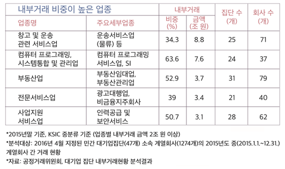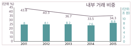 하지만 정부의 이러한 노력에도 불구하고 업계에서는 진정한 의미의 3PL업체가 얼마 되지 않는다고 말한다. 3PL업체 대표 사이에서는 3PL 비즈니스가 한국에서는 절대로 성공할 수 없다는 이야기가 돌기도 한다. 왜일까? 대기업의 물류자회사, 즉 2PL업체들이 막강한 영향력을 발휘하는 현재 국내 물류시장의 상황 때문이다. 실제 지난해 2016년 9월 공정거래위원회의 ‘대기업집단 내부거래현황 분석결과’에 따르면, 내부거래 금액이 큰 업종 중 5위가 운수업(대분류 기준)이었다. 또한 거래 금액이 2조 원 이상인 업종 가운데 내부거래 비중이 높은 업종 1위는 창고 및 운송 관련 서비스업으로 꼽혔다. 내부거래 비중은 최근 감소세이긴 하지만, 2015년 들어 소폭 상승하는 모습을 보이기도 했다. 내부거래 금액 역시 2014년 하락세로 돌아서는 듯하더니, 2015년 다시 상승했다.