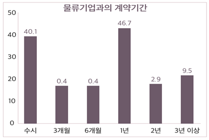 중소물류업체 한 관계자는 “10년 동안 쓸 수 있는 장비를 들여와도 화주와의 계약이 3년이라면, 투자비용을 3년으로 나눠 청구해야 하는데, 이는 다시 물류업체의 비용 문제로 돌아온다”고 전했다. 그는 또한 “계약기간이 짧으면 화주와 협상해야 할 기간이 빨리 돌아온다는 뜻인데 이를 이용해 물류업체를 제어하려고 하는 경우도 있다”며 “이는 근본적으로 화주와 물류업체 사이의 파트너십이 부족하기 때문에 생기는 인식”이라고 밝혔다.