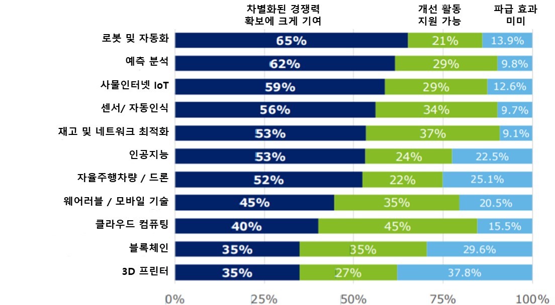- 현재 도입된 수준 측면에서 살펴보면 클라우드컴퓨팅, 센서 및 자동인식, 재고 및 네트워크 최적화 기술이 일반적이지만, 파급 효과 측면에서는 로봇 및 자동화, 예측 분석, 사물인터넷, 인공지능 기술 등이 파급력 높은 기술로 선정되었음 - 3D 프린터와 블록체인, 자율주행차량/드론 등 새롭게 등장한 차세대 기술들의 파급효과는 상대적으로 제한적인 것으로 나타났으며, 특히, 3D 프린터와 블록체인은 차별화된 경쟁력 확보에는 크게 기여하지 못할 것으로 전망되었음