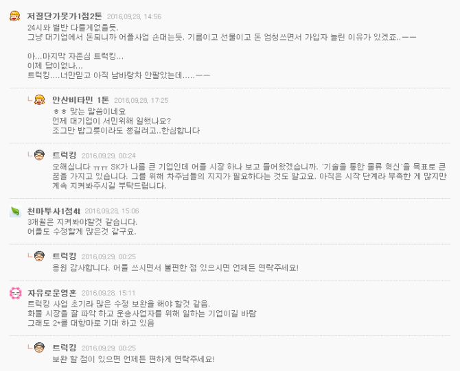 그림4. 네이버 카페 영운모(영업용화물차 운전자들의 모임)의 초기 트럭킹에 대한 차주 반응과 그에 일일이 응대하고 있는 트럭킹의 모습. 댓글을 달고 현장 모니터링을 하는 것은 김 실장 본인이라고 한다.