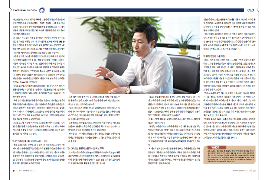 '취임 후, 9개월 만에 흑자 전환', '택배업계 장수 CEO'. 로젠 최정호 대표이사 앞에 붙는 수식어들이다. 최 대표는 2007년 로젠의 대표이사로 취임한 이후 당시 만성적자로 자본잠식 직전 상태의 회사를 획기적인 원가절감과 혁신활동을 통해 9개월 만에 적자기업에서 흑자기업으로 바꿔 놓았다. 출혈경쟁을 하는 '치킨게임' 탓에 수익성 악화로 허덕이던 국내 택배시장에서도 2009년 51억원이었던 세전이익을 2012년에는 123억원으로 상승시켰다. 같은 기간 국내 택배사들의 평균 수익률이 2~3%에 불과한 점을 감안할 때, 후발주자인 로젠의 성장세는 눈여겨볼만한 대목이다. 실제로 그의 경영실적은 경쟁업체 CEO들 사이에서도 화제가 됐다. 기자가 만난 모 대기업 택배사 CEO는 로젠 최정호 대표를 두고 '꼭 만나보고 싶은 분'이라고 표현하기까지 했다. 실적악화 등의 이유로 여러 택배사의 전문경영인들은 짧은 주기로 교체됐지만 최 대표는 2007년부터 6년째 CEO로 활동했다. 최 대표는 물류를 포함해 전 산업계에서도 보기 드문 장수 CEO인 셈이다. 최근 몇 년 사이에 택배업계 장수 CEO가 드물었다는 점에서 그의 롱런 비결이 더 궁금했다. 바로 최 대표를 인터뷰하게 된 배경이다. 더욱이 로젠은 '택배 빅4' 진입이 멀지 않은 상태다. 오는 4월, CJ대한통운과 CJ GLS가 합병되면 민간 택배사 중 매출규모로 업계 4위에 오를 전망이다. 과거 10여년 동안 깨지지 않던 국내 택배업계 순위에 지각 변동이 생기는 것이다. 특히, 이 기간 동안 대기업은 물론 몇몇 중소 택배사들이 사업 철수나 매각을 이유로 시장에서 퇴출됐던 것을 감안하면 2013년 로젠의 택배 빅4 진입은 대한민국 택배 역사상 의미있는 기록이 될 전망이다. 이렇듯 최 대표는 택배사의 새로운 한 페이지를 써내려가고 있는 인물이다. 어렸을 적 조선시대 고산자 김정호와 이름이 같다는 이유로 그의 별명은 '대동여지도'였다고 한다. 최 대표의 스마트 모바일 메신저(카카오톡)에도 그때 별명인 '대동여지도'로 자신을 소개하고 있을 정도다. 한반도 곳곳을 훑으며 과학적 실측지도인 대동여지도(大東輿地圖)가 만들어졌듯이 최 대표는 대한민국 택배 현장을 훑으며 업계의 지형도를 새롭게 그리는 CEO로서의 평판을 쌓아가고 있을지 모를 일이다. <editor> 정치를 '가능성의 예술'이라고 한다면, 기업 경영의 핵심 요체는 무엇일까? 수익성 악화로 고전 중인 국내 택배시장에서 해마다 영업이익을 늘려가며 샛별처럼 빛나는 CEO인 최정호 로젠 대표는 '스피드'와 '타이밍' 경영으로 그 실마리를 보여준다. 실제로 요즘처럼 경제 상황이 불투명하고 급변할수록 천시(天時)를 꿰뚫는 혜안과 신속한 대응이 일류 경영자의 최고 자질로 부상하고 있다. 최근 국내 택배시장이 그렇다. 한때 택배산업의 전망이 밝다는 소문이 대두된 적이 있었다. 경제가 발전하면서 이렇다 할 블루오션을 찾지 못한 사람들에게 택배가 뜰 것이라는 전망은 장밋빛 유혹으로 다가왔다. 택배에 진출하는 회사가 늘어난 것 역시 물류가 가능성이 있으리라는 기대 때문이었다. 그러나 안타깝게도 택배산업에 진출하는 회사들이 늘어나면서 한때 전망이 좋았던 택배회사들은 극심한 경쟁 상황 속에 내몰렸다. 모든 산업이 그렇듯 산업의 전망 보다 중요한 것은 그 산업의 한복판에서 어떻게 회사를 경영하는 가이기 때문이다. 그런 점에서 취임 9개월 만에 로젠을 적자기업에서 흑자기업으로 변화시킨 최 대표에게는 배울 점이 많다. 아무리 전망이 좋은 산업이라고 할지라도 그것이 어떤 리더를 만나느냐에 따라 회사에 얼마나 바뀔 수 있는가를 보여주는 실례이기 때문이다. 최 대표는 2007년 로젠의 대표이사로 취임한 이후 당시 만성적자로 자본잠식 직전 상태의 회사를 획기적인 원가절감과 혁신활동을 통해 9개월 만에 적자기업에서 흑자기업으로 바꿔 놓았다. 또한 침체된 경제상황 속에서도 2009년 51억 원이던 세전이익을 2012년에는 123억 원으로 상승시켰다. 이는 최정호 대표이사가 로젠 대표로 취임한 후 효율성을 중시하는 성과 중심의 조직 문화를 구현하고, 적극적인 선진 물류 인프라를 도입해 단기적인 성과가 아니라 지속성장이 가능한 조직으로 만들어낸 덕분이라고 평가되고 있다. 최 대표의 행보를 보다 보면 그의 좌우명과 비슷하게 행동하고 있음을 알 수 있다. 그의 좌우명은 세 가지다. ‘뜻이 있는 곳에 길이 있다’, ‘하늘은 스스로 돕는 자를 돕는다’, '인간이기에 모든 걸 할 수 있다' 그가 단기적인 성과 창출이 아니라 지속 성장이 가능한 조직으로 만든 것도 장기적으로 회사의 성장 기반을 만들려는 의도 때문이었다. “단기적인 성과는 한 달, 일 년 동안의 안정을 가져다줄 수는 있지만 회사의 장기적인 성장을 가져다줄 수는 없습니다. 더구나 회사의 구성원들을 위해서 지속가능한 성장이 가능한 회사로 만드는 건 경영자의 가장 큰 책무라고 생각합니다.” 이런 생각으로 그는 로젠에 강도 높은 혁신을 주문하였다. 사실 그동안의 물류산업은 스마트함보다 부지런함으로 승부를 했던 것이 현실이다. 그러나 최 대표의 생각은 조금 달랐다. 고객서비스가 모든 사업의 핵심이 된 이