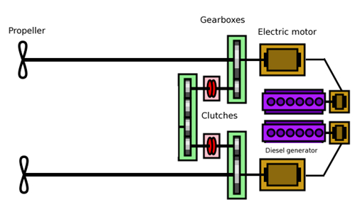 1) 샤프트에 의한 추진방식(shaftline propulsion) : 주 동력 장치에 샤프트가 연결되어 있고 샤프트는 감속 기어 혹은 고속 모터에 연결되거나 저속 모터에 의해 직접 구동되는 프로펠러를 회전시키는데 사용됨 2) 포드에 의한 추진방식(pod propulsion) : 이러한 추진방식은 조향 장치와 프로펠러 시스템의 조합임. 포드 추진 유닛은 기존의 프로펠러 위치에 장착되고 포드 내부에 전기 모터가 장착되게 되며, 프로펠러는 모터 샤프트에 직접 연결됨