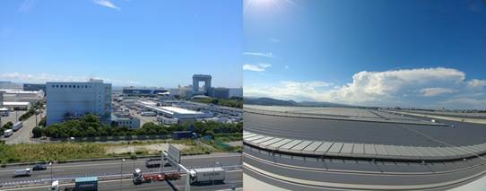 그림1. 일본 요코하마 물류단지(사진왼쪽)와 사가미하라 물류센터 옥상의 태양열판(사진오른쪽)