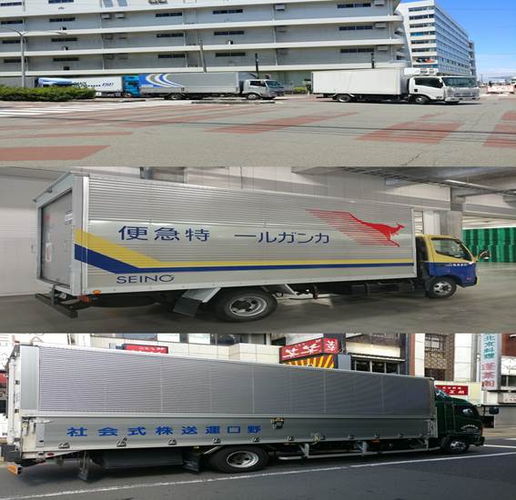 그림4. 일본 물류센터와 거리에서 만난 화물차들. 물론 모든 화물차가 깨끗한 것은 아니었지만, 상대적으로 깨끗한 화물차 비율이 매우 높았다. 그것도 그냥 깨끗한 게 아니라 무서울 정도로 깨끗했다.