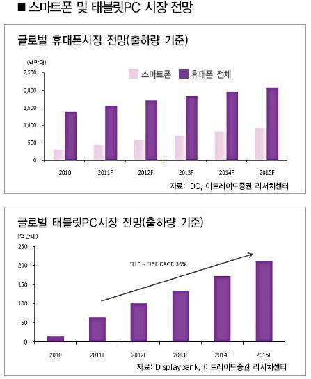 전체적으로 보면 금액 기준으로는 급성장(↑27.9%), 중량 기준으로는 하락(↓12%)으로 스마트폰을 중심으로 한 무선통신기기의 높은 성장 (↑47.6%)에도 불구하고, LCD(↓6.3%), 노트북(↓18.1%)등 주요 고중량 항공화물이 감소를 기록하며 중량 기준 실적 하락을 견인하면서 스마트기기가 항공화물의 패러다임을 바꾸고 있는 것이다. 하지만 스마트 기기가 TV, 전화기, PC등의 융합체는 될 수 있으나 PC 또는 TV 기능의 100% 구현은 불가능한 만큼, 해당 제품의 완벽한 대체재가 되는 것은 불가능하다고 보고 있다. 따라서 향후 스마트 기기의 보급률이 일정 구간에 오를 경우, 기존 소비자 IT 제품의 출하 회복이 예상 되나, 그 시기를 섣불리 예단하기는 어려운 시점이다. 아래의 도표가 보여주고 있는 스마트폰과 태블릿 PC 시장 전망을 보면 스마트폰은 이미 성숙단계에 진입중임을 알 수 있다.