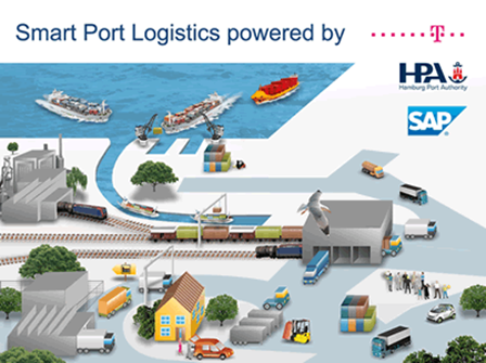 - 함부르크항은 좁은 도로 및 항만부지로 인해 고질적으로 차량정체 및 물류업체의 항만체류시간 증가에 시달리고 있었음 - 이를 해결하기 위해 주요 IT 기업들과 함께 함부르크항에 Smart Port Logistics 시범 프로젝트 시행 - 함부르크항은 이미 기존에도 첨단 정보시스템을 도입하고 있었으나 항만운영사 및 관련 물류기업들의 시스템 간 정보의 통합 및 공유는 이뤄지지 못하고 있었음 - Smart Port Logistics 프로젝트는 여러 물류기업의 각기 다른 정보시스템의 정보를 Deutsche Telekom의 Telematic ONE 정보 포탈시스템을 통해 통합함 - 동시에 SAP의 HANA 클라우드 플랫폼을 이용하여 Telematic ONE에 통합된 정보를 클라우드 기반으로 사람이나 차량의 모바일 디바이스에 전달함 - 해당 프로젝트의 도입으로 함부르크 항은 기존 항만 인프라를 최적으로 활용, 물류기업의 항만체류시간을 최소화 할 수 있었음