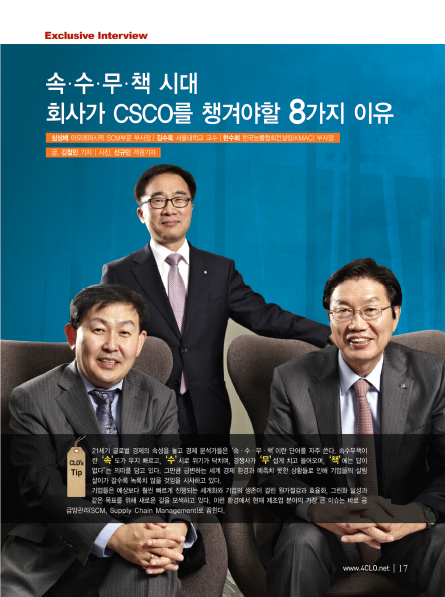 얼마 전, 서울대학교 경영대학 LG경영관에 현대?기아자동차, LG전자, 아모레퍼시픽, 경동나비엔 등 국내에서 SCM을 잘하기로 소문난 기업들의 최고공급망관리자(CSCO, Chief Supply Chain Officer) 10여명이 모였다. 서울대와 한국능률협회컨설팅(KMAC)이 공동주관한 CSCO포럼이 발족되는 날이었다. CSCO란 기업의 공급망을 관리해 비용절감, 리스크 관리 등의 업무를 담당하는 최고관리자를 뜻한다. 아직은 낯설지만 업무가 체계화, 분업화됨에 따라 공급망을 관리하는 CSCO의 역량은 갈수록 강화되고 있다. 급변하는 산업 전반에서 가장 화두가 된 개념이 '변동성(Volatility)'과 '유연성(Flexibility)'이라는 점은 CSCO에게 더 많은 역할을 주문하고 있다. 그래서 본지는 CSCO포럼을 찾아 국내 기업의 CSCO들이 직면한 SCM 현안들은 무엇인지, 또 이를 해결하기 위해 어떠한 전략을 구상하고 있는지 궁금했다. 특히, CSCO들에게 직면한 주요 이슈들 중에 ▲SCM과 가치창출 ▲글로벌화와 신흥경제 ▲지속가능성 ▲역량관리 및 개발이라는 네 가지 측면에서 집중 조명해보고 싶었다. 서울대와 한국능률협회컨설팅 SCM센터가 주축이 돼 결성된 CSCO포럼을 이끌고 있는 3인방, 아모레퍼시픽 심상배 부사장과 서울대학교 김수욱 교수, KMAC 한수희 부사장을 만나 “속수무책 시대, 기업이 CSCO를 챙겨야할 8가지 이유“에 대해 물어봤다.