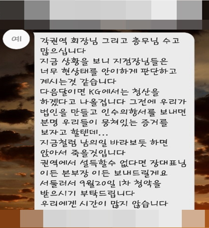 KG로지스 권역별 회장중 한 명인 K씨 이름으로 작성된 문건(KG로지스 지점장 사이에서 돌고 있는 문자)에 따르면 “지금 상황(청약금을 내지 않는 지점장들이 많은 상황)을 보니 지점장님들은 현사태를 너무 안이하게 판단하는 것 같다”며 “다음달(10월)이면 KG로지스가 청산을 하겠다고 나올 것이기에, 그전에 우리가 법인을 만들고 인수의향서를 보내 우리들이 뭉쳐있는 증거를 보여주지 않으면 가만 앉아서 죽을 것”이라 밝혔다(문건전문 첨부사진 참조). 문자에는 권역에서 설득할 수 없다면 ‘장대표님’이라도 보내드린다는 내용이 포함돼 있다.