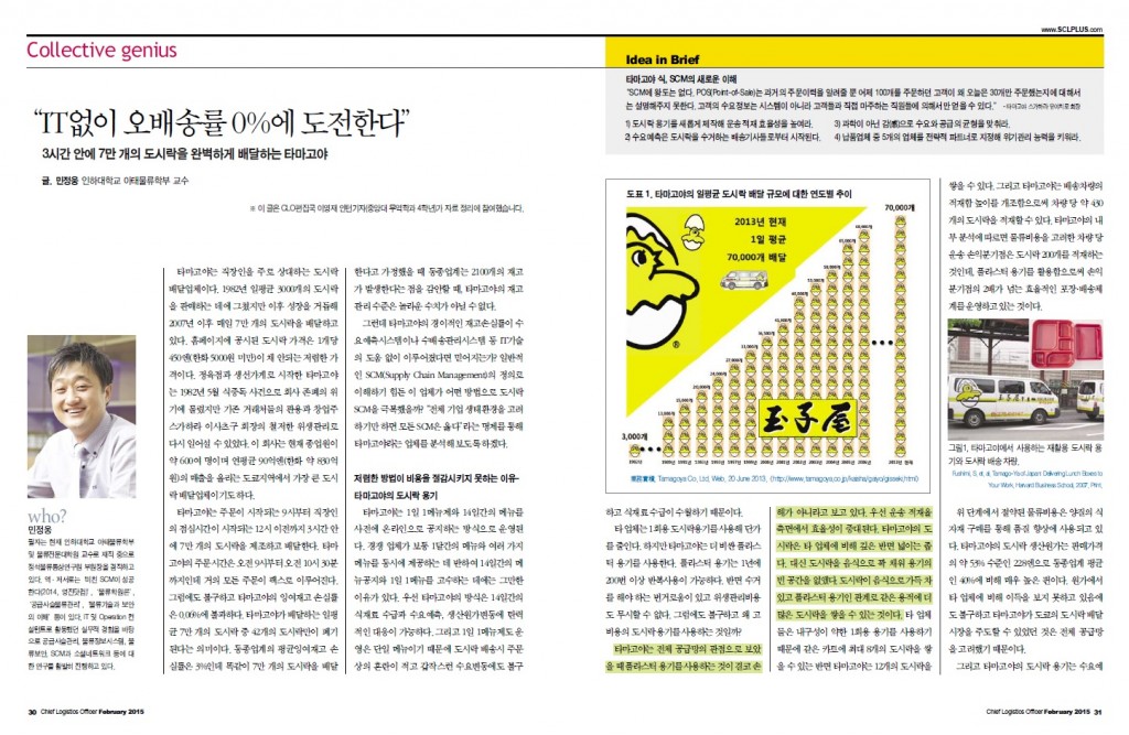 3시간 안에 7만 개의 도시락을 완벽하게 배달하는 타마고야 글. 민정웅 인하대학교 아태물류학부 교수 타마고야는 직장인을 주로 상대하는 도시락 배달업체이다. 1982년 일평균 3000개의 도시락을 판매하는 데에 그쳤지만 이후 성장을 거듭해 2007년 이후 매일 7만 개의 도시락을 배달하고 있다. 홈페이지에 공시된 도시락 가격은 1개당 450엔(한화 5000원 미만)이 채 안되는 저렴한 가격이다. 정육점과 생선가게로 시작한 타마고야는 1982년 5월 식중독 사건으로 회사 존폐의 위기에 몰렸지만 기존 거래처들의 관용과 창업주 스가하라 이사츠구 회장의 철저한 위생관리로 다시 일어설 수 있었다. 이 회사는 현재 종업원이 약 600여 명이며 연평균 90억엔(한화 약 830억원)의 매출을 올리는 도쿄지역에서 가장 큰 도시락 배달업체이기도 하다. 타마고야는 주문이 시작되는 9시부터 직장인의 점심시간이 시작되는 12시 이전까지 3시간 안에 7만 개의 도시락을 제조하고 배달한다. 타마고야의 주문시간은 오전 9시부터 오전 10시 30분까지인데 거의 모든 주문이 팩스로 이루어진다. 그럼에도 불구하고 타마고야의 잉여재고 손실률은 0.06%에 불과하다. 타마고야가 배달하는 일평균 7만 개의 도시락 중 42개의 도시락만이 폐기된다는 의미이다. 동종업계의 평균잉여재고 손실률은 3%인데 똑같이 7만 개의 도시락을 배달한다고 가정했을 때 동종업계는 2100개의 재고가 발생한다는 점을 감안할 때, 타마고야의 재고 관리 수준은 놀라운 수치가 아닐 수 없다. 그런데 타마고야의 경이적인 재고손실률이 수요예측시스템이나 수배송관리시스템 등 IT기술의 도움 없이 이루어졌다면 믿어지는가? 일반적인 SCM(Supply Chain Management)의 정의로 이해하기 힘든 이 업체가 어떤 방법으로 도시락 SCM을극복했을까?“ 전체기업생태환경을 고려하기만 하면 모든 SCM은 옳다”라는 명제를 통해 타마고야라는 업체를 분석해 보도록 하겠다.
