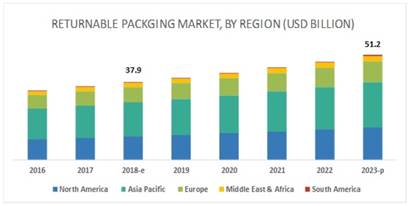 - Returnable Transport Packing(RTP)은 물류 공급망 전체에서 제품을 안전하고 효율적으로 운송하는 것을 목표로 하며, 여기서 중요한 점은 여러 용도로 반복해서 사용하여 기업은 낮은 비용으로 제품을 운송하고 투자수익을 높일 수 있는 효과가 있음 - E-commerce 시장 활성화로 인하여 많은 화물들이 운송/배송되기 때문에 E-commerce 시장 성장과 더불어 Returnable Transport Packing 시장의 규모는 2018년 383 억 달러로 측정되며, 2018년~2023년까지 6.2%의 CAGR(연평균 성장률)을 통해 2023년에는 520 억 달러에 이를 것으로 예상됨 - 특히, 아시아 태평양 RTP 시장은 인도 및 중국과 같이 인구가 많은 국가에서의 수요가 증가하기 때문에 가치 면에서 가장 높은 CAGR을 기록할 것으로 예측됨 (Figure 1 참조)