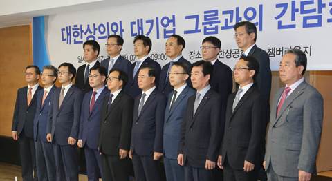 그림2. ▲ 대기업의 위엄. 한화, KT, SK, 삼성, 현대자동차, 롯데, LG, 현대중공업, 부영, 신세계, 두산, CJ, 포스코, GS, 한진 등 많은 학생들이 취업을 희망하는 대기업의 임원들이 간담회를 마치고 기념촬영하고 있다. (사진= 대한상의)