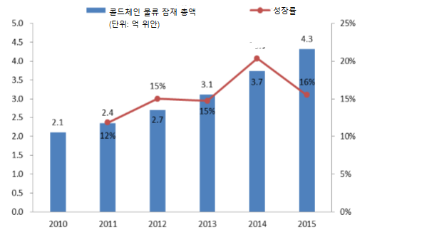 작성자 : CLO 임예리 기자 / LoTIS 2016.10.10 게시요식산업 거래액 2016년 말까지 3조 5,000억 위안(577조 원) 돌파할 것 전자상거래 신선식품 시장규모 2016년 960억 위안(16조 원) 달성 콜드체인 물류 잠재총액 2015년 4조 3,200억 위안(713조 원) 예상 위엔통-징둥 등 콜드체인 물류시장 공략, 블루오션을 찾아서
