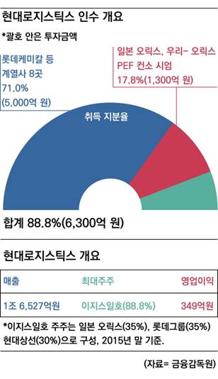 롯데그룹은 지난 2014년 특수목적회사(SPC)인 ‘이지스일호´를 통해 현대로지스틱스 지분을 확보 중이다. 현재 이지스일호가 보유 중인 현대로지스틱스 지분은 88.8 %(최대주주)이다. 이지스일호는 오릭스PE(35 %), 롯데그룹(35 %), 현대상선(30 %)등이 공동 출자한 회사로, 일본 오릭스가 이 회사 경영권을 보유 중이다. 롯데그룹의 현대로지스틱스 인수에는 약 5,000억 원 가량을 투자해 지분 71.0 %를 확보할 것으로 전했다. 일본 오릭스는 우리·오릭스 PEF와 컨소시엄을 이뤄 1,300억원을 재투자해 지분 17.8 %를 보유하게 될 경우, 현대로지스틱스 경영권은 오릭스에서 롯데그룹으로 넘어가는 구조다.