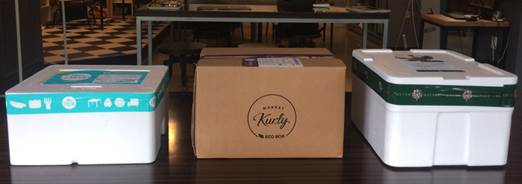 이에 대해 좌종호 헬로네이처 부대표는 “스티로폼 박스는 단가가 낮을수록 두께가 얇아진다거나 발포 밀도가 낮아지는데, 박스의 가격이 지나치게 저렴하면 포장 용기로서 기능성이 떨어질 수 있다”며 “비용을 더 투입하더라도 내부적인 기준에 맞게끔 부자재를 수급하고 있다”고 밝혔다. 또한 그는 “박스의 크기 역시 중요한 요소”라며 “자사는 상온제품 배송에 종이박스를 활용하는데, 고객이 여러 상품을 동시에 주문했을 때 그 가운데 스티로폼 박스가 필요한 제품이 있다면 스티로폼 박스를 종이박스 안에 넣어 추가 배송비가 생기지 않도록 한다”고 덧붙였다. 한편 많은 소비자들은 스티로폼 박스에 환경호르몬이나 4대 중금속(수은, 납, 카드뮴, 크롬) 등이 있는 것은 아닌지 우려한다. 실제로 세 업체의 수송용기에는 KS마크와 같은 승인번호가 표시되어 있지 않았다. 이에 대해 문의한 결과 세 업체 모두 환경인증을 보유한 업체로부터 상품을 납품받는다고 전해왔다. 에코박스는 안정보건공단 화학물질 인증(MSDS), 유해물질 제한지침(RoHS) 인증을 받았다. 성호경 우아한형제들 팀장은 “자사에 EPS 박스를 공급하는 업체는 ISO14001 인증(환경경영체제), RoHS 인증 등을 보유하고 있다”고 전했다. 수송용기② EPS vs 종이 앞선 두 업체와는 달리 마켓컬리는 신선식품 배송에 종이박스를 사용한다. 올해 4월 테스트용 박스를 만들어 사용하다 개선 과정을 거쳐, 현재는 ‘에코박스’라는 이름으로 전면 사용하고 있다. 종이박스의 내부에는 온도 유지를 위해 단열재로 사용되는 폴리에틸렌(PE) 폼을 부착했다. 마켓컬리에 따르면, 에코박스는 마켓컬리가 기존에 사용하던 스티로폼 박스보다 2배가량 비싸다.