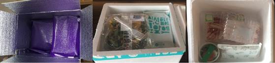그림4. ▲ (왼쪽부터)마켓컬리, 배민프레시, 헬로네이처에서 온 박스를 막 개봉했을 때의 모습