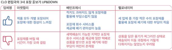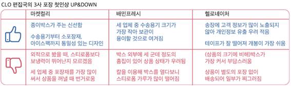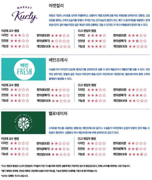 물론 상품만 제대로 도착하면 포장은 어찌됐든 전혀 신경 쓰지 않는 고객도 있다. 그러나 과포장과 그것의 번거로운 처리 과정, 환경에 끼치는 좋지 않은 영향에 거부감을 느끼는 고객들 역시 상당수 존재하며, 기업 입장에서는 그들의 피드백을 무시할 수 없다. 기자 역시 모든 실험을 종료한 뒤 3사의 박스를 한꺼번에 치우면서 ‘건강을 위해 신선식품을 주문했는데, 쓰레기로 버릴 물건이 오히려 많아졌다’는 생각을 하게 됐다. 신선하고 온전한 상태의 상품을 원하면서도, 포장에 대한 부담은 덜고 싶다. 이런 아이러니한 고객의 욕구를 만족시키기 위한 업체들의 고민 역시 깊어지고 있다. 좌종호 헬로네이처 부대표는 “자사가 최근 SK플래닛에 편입되면서 비용효율화를 통해 부자재 비용에 대한 고민은 덜었지만, 아이스팩부터 완충재, 드라이아이스, 은박 파우치, 스티로폼까지 사용하다 보니 이것이 소비자에게 과포장으로 인식되기도 한다”며 “현재 배송시간이 짧은 지역을 위주로 포장 간소화를 시범 도입하는 것이 논의되고 있는 상태”라고 전했다. 실제로 헬로네이처는 8월 중으로 은박 소포장재 대신 재활용할 수 있는 종이 소포장재를 도입할 계획이다. 마켓컬리 측도 비슷하다. 허소영 마켓컬리 패지지 TF팀 담당은 “식품의 안전성이 가장 중요하지만, 이후 포장 간소화 문제도 답을 찾고자 한다”며 “다시 사용할 수 있는 포장재 등을 고민하고 있다”고 밝혔다. 한편 배민프레시는 상품 안전에 초점을 맞춰 당분간 지금과 같은 포장 매뉴얼을 유지한다는 입장이다. 가치를 전달하는 포장 기자는 이번 실험을 최대한 소비자의 관점에서 진행하고자 했다. 소비자의 눈으로 봤더니 수송용기, 즉 스티로폼 박스와 종이박스가 주는 차이가 가장 크게 다가왔다. 기타 포장재나 상품의 배치 등에서는 별 차이가 보이지 않았다. (부분적으로 수송용기나 상품을 담은 용기가 훼손되긴 했지만, 상품 자체에 손상이 가해진 경우는 없었다.) 출고부터 배송까지 10시간이 채 걸리지 않는 새벽배송이기에 고급 포장기술을 사용하지 않더라도 비교적 안전하게 배송할 수 있기 때문일 것이다. 실제로 세 업체는 모두 냉장차량으로 상품을 직접 배송해 안전한 배송 환경을 구축하고 있기도 하다. 포장은 상품과 함께 고객이 기대하는 가치와 기업이 고객에게 전달하고자 하는 가치를 반영한다. 삼겹살을 주문한 고객과 다이어트 주문한 고객이 기대하는 가치는 다르다. 삼겹살은 신선하게 오면 되지만, 다이어트 도시락은 신선도와 함께 높은 품질과 고급스러움을 원할 것이다. 상품을 둘러싼 포장에서 차이점을 느끼지 못했다면, 기업이 전달하고자 하는 가치 역시 캐치하기 어렵다. 3사 모두 프리미엄 신선식품을 상품으로 내세우고, 새벽배송이라는 배송 서비스를 제공하고 있지만, 현재까지는 포장에서 각 업체만의 색을 찾기란 힘들었다라는 것이 CLO 편집국과 이강대 교수의 공통 의견이었다. 이 교수는 “세 업체의 포장을 전체적으로 보면, 소비자가 원하는 배송가치를 충분히 인지하고 있는지 모르겠다”고 전했다. 온라인 신선식품 시장은 앞으로도 계속 성장할 것으로 예상된다. 세 업체의 포장 전략에서도 변화의 움직임이 보이기 시작했다. 마켓컬리는 에코박스, 헬로네이처는 새로운 수송용기를 도입하며, 포장 간소화에 대한 고민을 하고 있고, 배민프레시는 EPS박스보다 내구력이 강하면서 재사용이 가능한 EPP(폴리프로필렌)박스 도입을 고려 중이다. 온라인에서 신선식품을 주문하는 고객이 늘어나면서 고객이 추구하는 가치는 다양해질 것이다. 과연 ‘고객이 경험하고자 하는 가치’를 전달할 수 있는 포장이 출현할 수 있을지 기대해본다.