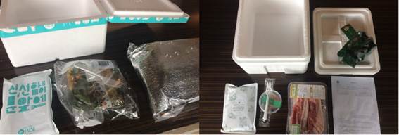 그림6. ▲ (왼쪽부터)배민프레시와 헬로네이처 박스 안에 들어있는 상품과 포장재
