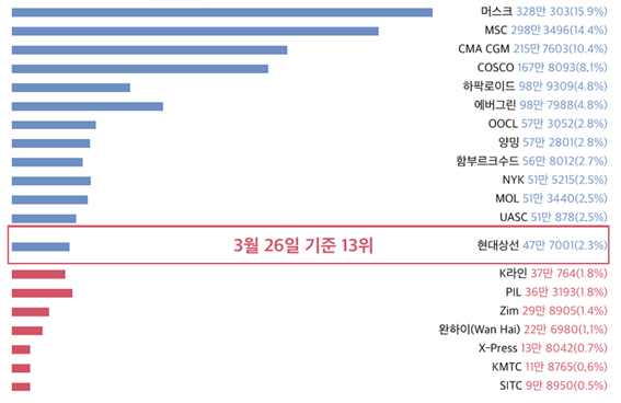 그림4. 해운선사 선복량 순위(3월 26일 기준) (단위: TEU) *괄호 안은 시장 점유율