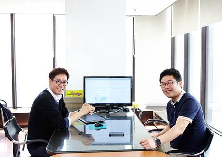 그림1. 스윗트래커 김영준 대표(오른쪽), 김범수 COO(왼쪽). 김범수 COO는 2005년 11월부터 2012년 2월까지 도서 등 소형택배 전문회사 ‘이노지스’를 창업하여 운영해온 경험이 있다.