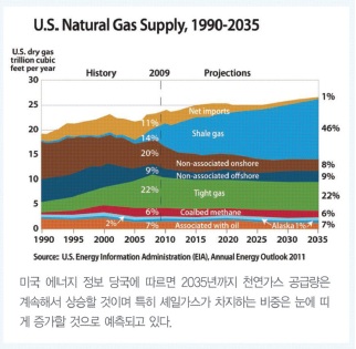 셰일 가스는 에너지 산업 구조를 급격히 재편시켰다. 미국 에너지 정보 당국에 따르면, 지난 10년간 셰일 가스 생산은 12배 증가했으며 현재 미국 전체 가스 생산에서 25%를 차지한다. 오늘날 대부분은 셰일 가스 생산방식으로 이루어지며 이는 밑에 보여지는 바와 같이 앞으로 20년간 빠르게 증가할 것이다.