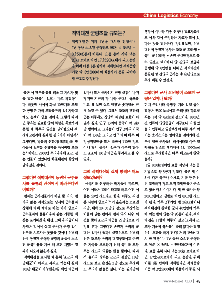 현재 우리나라 국방부 기준 일일 급식 열량은 3300 kcal이고 우리나라 학교급식은 1식 약 820kcal 정도이다. 1800년전 인류의 영양공급이 지금보다 더 좋았을리 만무하고 일반백성이 하루 세끼 먹기는 호사스러운 일이었을 것이기에 전투에 임한 군사들의 배식이라도 아주 열악했을 것으로 생각해서 1일 1000kcal 정도로 추정한다면 너무 배고프지 않았을까? 1일 1000kcal이면 요즘 식당서 먹는 공기밥으로 약 3공기 정도다. 물론 밥 이외에 다른 육류나 식재료, 기름 등은 전혀 포함하지 않고 오직 쌀밥만을 기준으로 했을 때의 이야기다. 밥 한 공기는 약 200그램이고 생쌀로 치면 80그램 정도가 된다. 하루 3공기면 쌀 240그램이니 적벽대전에 참여한 군사 40만명이 하루에 먹는 쌀의 양은 약 96톤이 된다. 적벽대전은 11월에 치루어 졌고(그래서 조조가 겨울에 북서풍이 불리 없다는 결정적인 오판을 하게 된다) 거의 1년을 대치 한 전쟁이니 1년 동안 소요된 군량만도 96톤 x 365일 = 3만5040톤에 이른다. 요즘 흔히 사다 먹는 20kg 포대로 치면 17만5200포대가 되고 운반을 위해 이를 1톤 탑차에 적재한다면 적재중량 기준 약 3만5000대의 화물차가 동원 되어야 할 규모이다. 물론 당시 모병상황은 직업군인이 극소수이고 대부분은 전쟁이 나면 동원되는 군사들로 채워져 자기가 먹을 양식을 가지고 오는 경우도 있었다고 하니 요즘 보급체계와 비교할 상황은 아니지만 어쨌든 적벽이 농사짓는 벌판이 아니고서야 어디선가 연간 3만5천톤의 군량이 운송되는 물류활동이 이루어졌다고 볼 수밖에 없지 않겠는가? 1톤 탑차가 1회 운행한 상황으로 가정하고 1회 운송비용을 우리나라 돈 10만원으로 계산하면 적벽대전을 위해 소요된 군량의 운송에 따른 물류비용만 총 35억원으로 추정 할 수 있다. 사실 물류비용은 각종 무기와 장비, 보급품 등에 소요된 비용에 비한다면 새발의 피도 안되는 금액이고 보면, 수나라가 고구려와의 힘든 싸움 끝에 패전하고 쇠락의 길을 재촉한 이유가 충분히 짐작이 가는 대목이다. 오늘도 각종 보도를 통해 수시로 들려오는 북한 주민들의 참담한 실상을 접하면서 북한정권의 전쟁준비에 소모되는 막대한 비용이 따뜻한 공기밥으로 북한 주민들에게 전해지는 날이 빨리 오기를 간절히 기대 해 본다. 아울러 가까운 미래에 통일 대한민국의 위상이 물류대국으로 더욱 빛나기를 물류인의 한사람으로서 가슴 벅차게 기원하는 바이다.