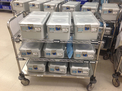 사진 설명: 수술용 케이스가 담긴 카트. 수술 종류에 따라 케이스의 개수가 달라진다. 위 사진 중앙에 있는 9개의 케이스는 한 번의 무릎 수술에서 사용될 예정이다.