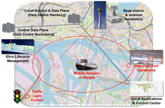 독일 함부르크항은 디지털 트윈 모형에 5G 무선통신 기술을 통합하였다. 함부르크항의 디지털 트윈 모형은 5G-MoNArch(5G Mobile Network Architecture) 프로젝트의 테스트베드로 활용되었다. 5G-MoNArch 프로젝트는 2017년부터 2019년까지 유럽위원회(European Commission)의 자금 지원으로 진행되었고, 유연하고 적응성이 높으며 프로그램 가능한 5G 아키텍처의 개발과 검증을 목적으로 하였다. 함부르크항에서 5G 무선통신 기술은 항만 내의 다양한 요구사항을 해결하기 위해 세 부분에 활용되었다. 첫 번째는 육상 연계영역의 차량 흐름을 개선하기 위해 신호등을 함부르크항 선박 교통관제 센터에 연결하도록 설계된 고신뢰성 저지연(ultra-reliable low latency) 통신이다. 두 번째는 항만 자산의 관리, 유지보수와 같은 항만 운영을 개선하기 위해 기술지원팀의 대화형 증강현실 서비스를 제공하는 향상된 모바일 광대역 통신이다. 세 번째는 해양 연계영역의 환경 측정을 위해 이동하는 바지선에 설치된 환경 센서를 함부르크 항만공사의 애플리케이션 클라우드에 연결하기 위해 개발된 대규모 컴퓨터(machine) 유형 통신이다.