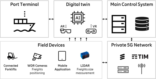 이탈리아 리보르노항 역시 5G 무선통신 기술을 실험적으로 적용하고 있다. 리보르노 항만공사는 운영 영역의 스마트 센서, 3차원 라이다(LiDAR), 역광보정(wide dynamic range) 카메라로부터 수집되는 대량의 자료를 5G 무선통신을 통해 확보할 수 있다. 리보르노항의 디지털 트윈 모형은 화물과 장비 등이 포함된 항만 옥외 영역을 대상으로 하였다. 나무상자와 같은 화물이 모형화되고 역광보정 카메라에 의해 감시된다. 기상 조건에 따라 빛의 강도와 방향이 지속해서 변화하는 옥외 환경에서 역광보정 카메라는 화물의 위치 지정과 추적 작업을 정확하게 수행하는데 중요한 임무를 담당한다. 역광보정 카메라의 스트리밍 동영상은 물체 및 위치 식별을 담당하는 소프트웨어에 연결된다. 또한 지게차와 같은 차량에 설치된 센서에 의해 실시간 자료가 수집된다. 에릭슨(스웨덴 통신장비 제조기업)이 공급한 인공지능 기반 플랫폼은 실시간 정보흐름과 관련된 물류 작업과 활동의 순서를 결정한다. 플랫폼이 다루는 작업은 선박 하역, 물품재고 관리뿐만 아니라 지게차와 화물의 이동, 추적, 위치 지정 등을 포함한다. 디지털 트윈을 기반으로 하는 시각화를 통해 운영 효율성 향상, 대용량 데이터 관리, 우발적 사건 방지, 손실 방지 및 위험 예측 등의 효과를 얻고 있다.