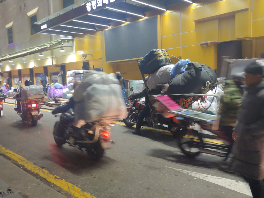 그림1. 동대문 시장을 가르는 퀵서비스 오토바이. 이들이 배달대행 라이더가 아닌 이유는 배달통이 아닌 짐받이가 달려있는 것에서 확인할 수 있다.