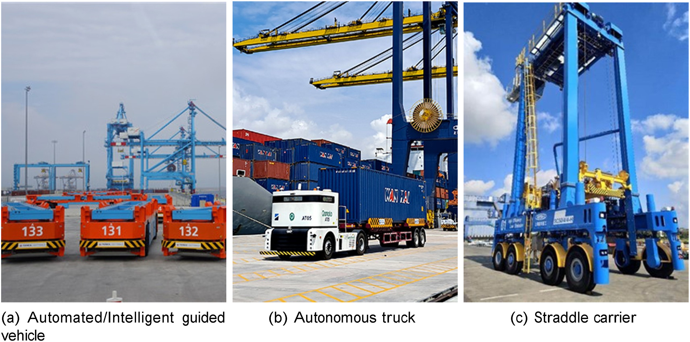 터미널 이송 차량은 터미널의 안벽과 야드 사이에서 컨테이너를 운반하는 장비이다. 수동으로 운전하는 YT(yard truck)가 현재 가장 일반적으로 사용되는 유형이고, 다른 유형으로 SC(straddle carrier)가 있다. SC는 YT와 달리 컨테이너를 직접 집거나 놓을 수 있다. 최근에는 숙련된 운전사의 부족 현상이 증가함에 따라 이송 차량의 무인화가 활발하게 진행되고 있다. 무인 이송 차량의 유형에는 AGV(automated guided vehicle), IGV(intelligent guided vehicle), Auto-SC, AT(autonomous truck) 등이 있다. 이들은 기계적 설계, 내비게이션 및 제어, 인프라, 운영 측면에서 차이점이 있다.