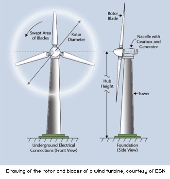 풍력 에너지로 전기를 생산하는 방법은 다양한 기술이 있으며, 기본적으로 프로펠러타입(Propeller Type), 다리우스타입(Darrieus Type), 사보니우스타입(Savonius Type), 자이로밀타입(Gyro-mill Type), 헬리컬타입(Helical Type) 등이 활발하게 개발 중에 있다. 이 중 현재 널리 상용화 되어있는 프로펠러형 풍력 터빈은 바람에 의해 3개의 블레이드가 회전하며 이에 의해 전기를 생산한다. 본문에서는 이 장치의 사용을 가정하였다.