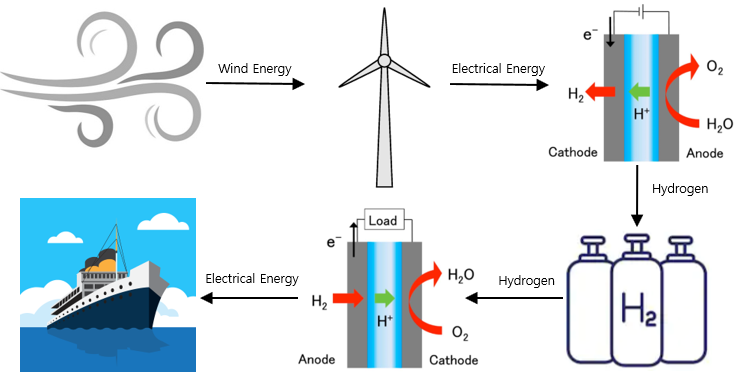 풍력터빈을 통해 생산한 전기에너지로 물을 분해하여 수소로 저장할 수 있다. 물을 분해하여 수소를 생산하는 수전해기술은 촉매, 전해질, 분리막 등의 다양한 핵심소재로 구성된다. 물(H2O)분자가 양극의 촉매표면에서 반응하여 양성자(Proton, H+)와 산소(O2)로 분해되며, 산소는 시스템을 빠져나가고, 양성자는 양성자분리막(PEM)을 통과하게 된다. 분리막을 통과한 양성자는 다른 촉매와 만나 수소분자(H2)가 되어 저장가능한 형태가 된다. 수소는 고압으로 압축 저장되며 수요에 따라 다시 전기로 변환할 수 있다. 수전해기술을 통해 생산된 수소분자(H2)는 수요에 따라 다시 전기에너지로 변환시킬 수 있으며 수소연료전지를 사용한다. 즉, 연료전지는 수전해기술을 역으로 활용한 것이다. 수소가 촉매와 반응하여 전기를 발생시키고 수소이온(H+)로 분해되고, 산소(O2)와 만나 물(H2O) 분자가 만들어진다. 앞서 소개한 풍력에너지를 이용하여 1차적으로 전기에너지를 생산하고, 수전해장치를 통해 전기에너지를 저장하며 연료전지를 사용해 다시 전기를 소비할 수 있는 풍력-수소 에너지 생산 공정은 아래 그림3.과 같다. 예비 평가 및 실제 공정설계 시 효율 이외에도 바람 방향, 경사진 지형, 터빈의 경사 및 각도, 전하율, 시스템 수명, 출력밀도 등을 고려한 자세한 공정설계가 필요할 것이다.