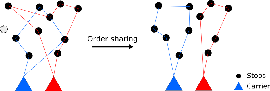 - 공유 물류는 물품을 소유하는 것이 아닌 서로 대여해 주고 차용해 쓰는 개념으로 인식하여 물류 활동을 하는 것을 말하며, 이를 통해 차량의 적재율 향상, 공차 운행 감소, 복화(復貨)의 활성화, 보관 효율의 향상, 작업의 생력화(省力化) 등을 통해 탄소 발생량을 크게 줄일 수 있음. - 다양한 물류 산업의 이해관계자들은 고객의 주문 또는 요청을 결합, 공유 또는 교환하여 자체 운송 기능을 최적화하고 전체적으로 동일한 수준의 서비스를 제공할 수 있어 운송 차량 운행을 효율적으로 운행할 수 있어 아래 그림과 같이 최종 목적지에 대한 방문 횟수를 줄이고 차량 경로를 개선하여 차량의 총 이동 거리가 줄어들고 더 나은 서비스 제공 및 탄소 절감의 효과가 있음.