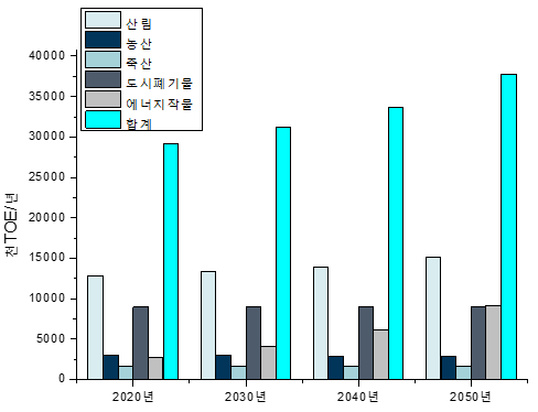 그림 2에서 보이는 것과 같이 국내의 이론적 바이오매스 잠재량은 점차 증가할 것으로 예측된다. 이는 산림정책의 변화 및 에너지작물의 재배를 통해 생산을 가속화할 수 있기 때문이다. 이 수치는 2030 국가온실가스 감축목표 중 40%가량을 국내 바이오매스잠재량으로 자급할 수 있는 수준에 해당한다 [2].