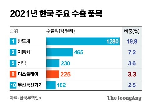 그림2. 2021년 한국 주요 수출 품목의 수출액 및 비중