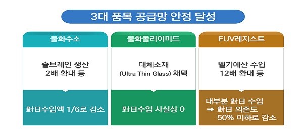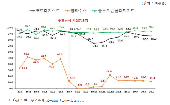 - PR(Photoresist, 감광제) 초반 PR 수급에 핵심적인 대응책은 벨기에를 통한 우회 수입이었다. 수출 규제 이후 일본산 수입 비중이 최대 73.9%(2019년 10월)까지 감소했고 2020년 5월을 기준으로 86.7%를 기록했다. 반대로, 벨기에산 PR 수입 비중은 수출 규제 직전 0.3%에서 16.8%(2019년 11월)로 증가했다. 이는 실제로 새로운 공급망으로 벨기에 업체를 통해 수입한 것이 아닌 기존에 거래하던 일본 회사 중 벨기에에 합작법인이 존재하는 경우 그를 통해 수입하는 경우이다. 합작 법인을 통해 수입하는 것은 수출 규제 내용 중 제3국에서 수입하는 것에 대한 제재에 관련된 내용이 없었기 때문에 가능했다. 실제로, 삼성전자의 경우 일본 회사인 JSR의 벨기에 합작 법인인 루뱅공장을 통해 EUV PR을 수입했다. 동시에 PR 제품 국산화를 시도했다. SK materials는 EUV PR과 관련된 특허를 보유하고 있는 금호석유화학 전자소재 부민을 인수하고 PR 생산 공장을 건설하기 위해서 400억가량을 투자했다. 삼성전자는 EUV PR을 생산하는 미국 인프리아에 SK 하이닉스, TSMC 등과 공동으로 3,300만 달러를 투자하였고 동신쎄미켐에 EUV PR 생산을 위해 투자하여 국산화에 성공한 후 양산 라인도 도입할 것으로 보인다. 2021년 7월 사업통상자원부는 일본산 PR 수입 의존도가 50% 이하로 감소했고 이는 벨기에에서 수입하는 것이 12배 늘어난 것의 원인이 크다고 밝혔다. - HF(hydrogen fluoride, 불화수소) HF는 중국과 대만을 통한 수입으로 새로운 공급망을 구축했다. 대만의 경우 2019년 6월에 3.8%에 불과했던 수입 비중이 2020년 2월 이후 39.9%로 대폭 상승했으며, 중국 역시도 70%를 상회할 만큼 큰 비중을 차지하게 되었다. 대만과 중국산 HF 수입이 많이 증가하면서 일본산 HF의 수입 비중은 큰 폭으로 감소했고 수출 규제 직후인 2019년 8월과 9월은 수입 비중이 0%였다. 그러나 2019년 8월과 2020년 2월 일본에서 HF와 관련된 수출 규제를 완화하여 그 이후 약 12% 정도의 비중을 차지하고 있다. HF의 국산화는 대부분 솔브레인에서 맡고 있다. 솔브레인은 2020년 1월 순도 12Nine(99.9999999999% 수준의 순도를 나타냄)의 초고순도 액체 불화수소 대량 생산 능력을 확보하였고 이는 국내 수요의 70~80% 정도 대응할 수 있을 것으로 보인다. LG 디스플레이는 2019년 10월 중 디스플레이 생산용 액체 HF를 전부 국산 제품으로 대체 투입하였다고 한다. SK materials는 2019년 초고순도 HF 개발에 성공, 2020년 6월 양산 시작 및 2023년에는 국산화율 70%를 목표로 노력 중이다. 국산화의 노력으로 솔브레인의 생산 능력이 2배 확대되는 등 성과가 두드러졌고 2021년 7월 HF의 수입액은 규제 전 대비 1/6 수준으로 감소하는 성과를 보였다. - FPI(Fluorine polyimide, 불화 폴리이미드) FPI의 경우 일본산 수입 비중이 규제 이후에도 큰 변화 없이 90% 정도를 유지했다. 이는 수출 규제 이전부터 어느 정도 국산화가 진행되어 있었기에 가능했다. 코오롱인더스트리에서 2016년에 FPI 개발에 성공했고 2019년 상반기부터 양산에 돌입했다. 실제로 2018년 7월~2019년 5월에 수입 규모를 확인하면, 2,400만 달러 정도로 동기간에 PR(2억 8,600만 달러), HF(1억 4,700만 달러)와 비교했을 때 수입 규모 자체가 아주 작았음을 확인할 수 있다. 게다가, 수출 규제에 FPI 생산 원료인 polyamic acid(불화폴리아믹산)가 포함되지 않아서 원료를 수입 후 국내에서 가공하여 사용하는 방법도 채택할 수 있었다. 그런데도 수출 규제를 기점으로 제대로 된 국산화를 이루기 위해서 SKC는 충북 진천에 연간 100m2 규모의 FPI 생산 공장을 구축하고 테스트를 진행 중이다. 그리고 2020년 이후 삼성전자에서는 폴더블스마트폰에서 FPI 대신 UTG(Ultrathin Glass)를 채택하면서, FPI에 대한 수출 규제 문제는 거의 없어졌다고 볼 수 있다.