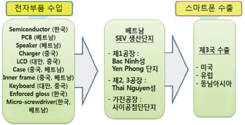 ㅇ 주요 부품과 소재를 베트남 현지, 중국 등에서 공급받아 조립 생산 후 완제품을 제3국에 수출함 ㅇ 이를 통해 안정적인 GVC 조달체계를구축하여 동아시아 1차, 2차 벤더를 육성해오는데 기여