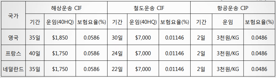 유럽향 운송수단 별 운임, 기간 비교 (기계류 품목을 기준한 예시)