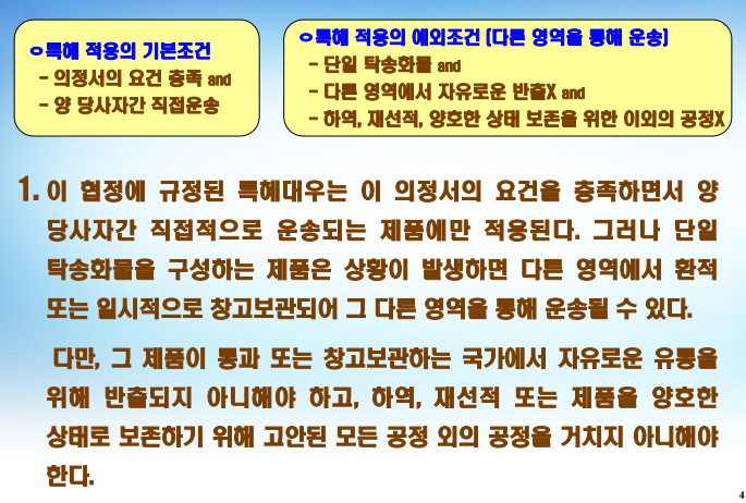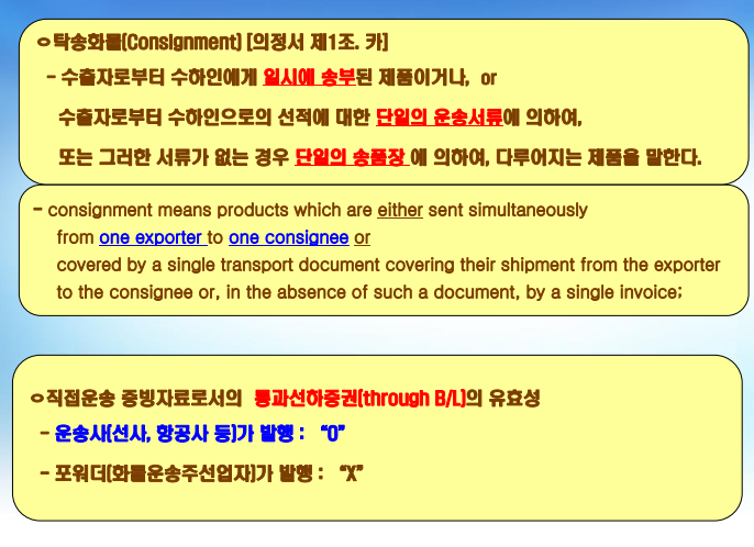 ㅇ 직접운송(Direct Transport) 조항은 FTA 체결국 간에 혜택을 받을 수 있는 상품이 중간에 제3국을 거쳐도 원산지 상태가 유지되었음을 입증해야만 한다는 규정 - 이는 관세 혜택을 보장받기 위해 중요한 조건으로, 수출품이 제3국을 경유할 때 다른 상품으로 가공되거나 변형되지 않았음을 증명해야 함