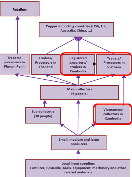 먼저 Farmer는 후추열매를 재배·수확하여 햇볕에 건조까지의 작업을 수행한다. 다음 단계는 Collector가 중간에서 시장을 연결하는 유통상 역할을 하는데 이것은 다시 Sub-collector와 Main-collector로 역할을 나눈다. Sub-collector들이 후추농가를 돌며 품질을 고르며 소량(10kg~1ton)을 농장에서 구매, 이를 다시 Main-collector에게 공급한다. 이들은 다수의 Sub-collector들로부터 거둬들인 후추원두를 가공·세척 후 Trader에게 공급하는데, 이렇게 가공능력이 있고 자본력이 있는 Main-collector들은 Trader도 병행하고 있다. 아래 유통구조 도식화 그림은 캄보디아 후추 시장구조를 구체적으로 보여주고 있다. 여기서 주목할 점은 바로 Vietnamese collectors in Cambodia이다. 이는 글자 그대로 캄보디아 시장에서 베트남 Collector의 활동이 시스템화 되어 있다는 것을 알 수 있다. 즉, 이들에 의해 캄보디아 후추가 베트남시장으로 제한없이 유통이 되고 있다는 것으로 파악 될 수 있으며, 거래주체가 Trader 간의 무역거래가 아니라, 마치 한 국가 안의 로컬 거래처럼 지역 상인들에 의해 캄보디아 후추가 베트남으로 문제없이 반입되고 있는 것으로 해석될 수 있다. 또한, 양쪽 후추를 동시에 취급하고 같은 창고에 재고 운영을 하는 이들에 의해 베트남 또는 캄보디아 후추는 언제든지 상거래 목적에 따라 자율적으로 혼합유통 및 혼합수출이 되고 있을 가능성을 말해준다.
