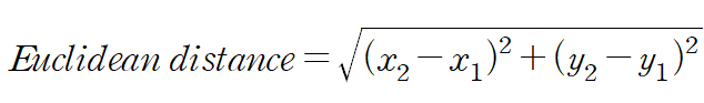 직선거리를 구하는 방식은 가장 대중적인 방식이라 볼 수 있다. 두 지점 과 사이의 직선거리는 제곱근 수식을 이용해 구하는 방식이다.
