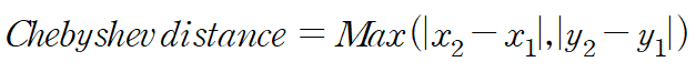 Chebyshev 혹은 Tchebychev 라고도 많이 번역되는 러시아 수학자 쳬비셰프의 이름을 딴 거리측정 방식이다. 이는 두 저점 간의 이동거리 최대치를 구하는 방식이라 볼 수 있다.