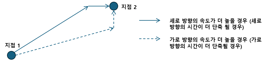 과거 신선대컨테이너터미널에서 자동화 야드크레인이 국내 최초로 설치되었을 때 그 기계적 성능 개선 중 하나로 gantry와 trolley 움직임을 쳬비셰프 방식으로 동시에 움직이도록 한 것이 소개되었다. 그 전 수동형 야드크레인의 경우 직각거리로 동작해 gantry의 움직임이 완료된 후 trolley 움직임이 시작되었다. 쳬비셰프 거리측정 방식의 묘미는 거리가 아닌 시간단위로 측정할 때 기계적 동장방식이 완전히 달라질 수 있다는 점이다. 직선거리나 직각거리에서는 시간단위로 환산하더라도 기계장비의 움직임이 달라질 이유는 없다. 그러나 쳬비셰프 방식에서는 아래 <그림 4>에서처럼 이동시간 단축을 위한 동작방식이 달라질 수 있고 더 나아가 장비 일정계획도 달라질 수 있다 (Zhou et al., 2020).