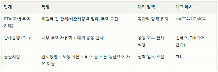 -경제통합은 국가 간 상품과 서비스의 거래 장벽을 낮추고 시장 통합 수준에 따라 FTA(자유무역지대), 관세동맹, 공동시장, 경제동맹/통화동맹 등 여러 단계로 발전해 온 체계 · FTA(Free Trade Area)는 회원국 간 관세·비관세장벽 철폐를 통해 무역 촉진, 외부국과는 독자 정책 유지하는 구조, 예: NAFTA/USMCA · 관세동맹(CU)은 내부 무역 자유화에 더해 외부국에 대한 공동 외부 관세를 채택, 예: 유럽 연합(EU) 전신 벤룩스 등 · 공동시장(Common Market)은 자본·노동·서비스 이동까지 허용하며, EU처럼 노동·자본의 자유 이동 및 정책 조율이 이루어지는 고도 단계