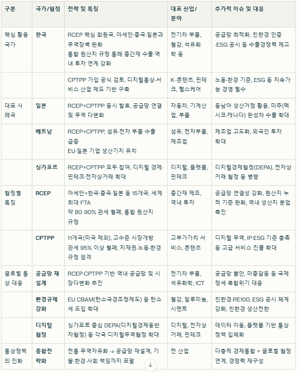 -한국은 RCEP 핵심 회원으로, ASEAN, 일본, 중국 등과의 관세 혜택과 투자 활성화 기반을 확보. CPTPP 가입 검토도 진행 중으로, 한국 기업의 디지털 무역·ESG 기준 충족 및 서비스 수출 확대를 위한 전략적 필요성이 대두됨 -일본, 베트남, 신남방 국가들은 RCEP와 CPTPP 동시가입으로 제조업·서비스 수출 증대 효과 확인. 예: 싱가포르는 두 협정 참여 시 GDP 2% 상승 효과 전망 -최근 공급망 리스크, 무역분쟁, ESG 및 탄소국경조정제도(CBAM) 등 글로벌 이슈에 대응하기 위해 고품질 FTA, 디지털 무역협정, 투자자 보호 약정 확대 등의 정책 수단이 강화